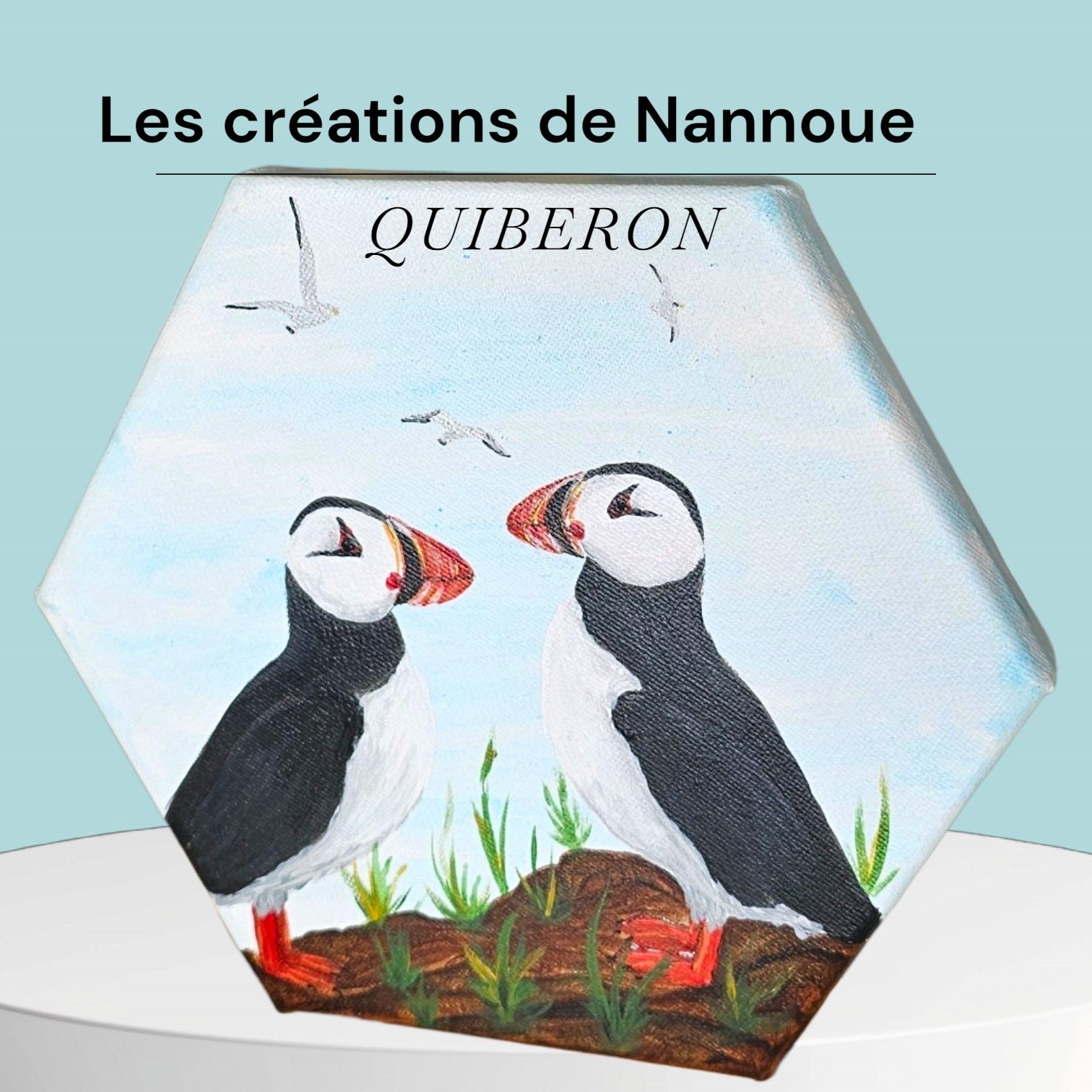 Toile hexagonale 10x10 , peinture acrylique : JEUNE MOUETTE RIEUSE. Artiste Nannoue à Port-maria Quiberon.